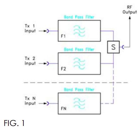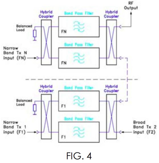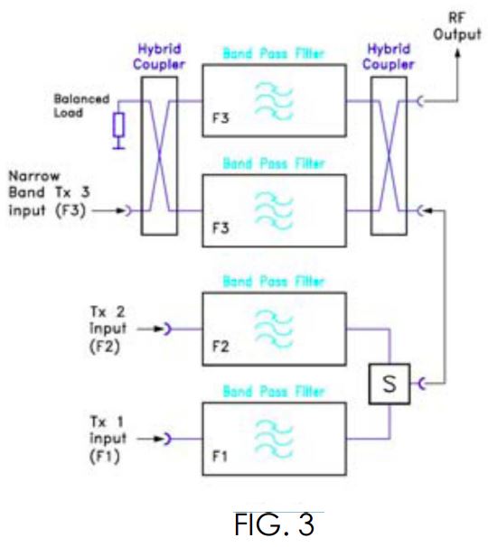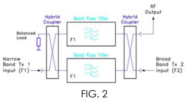 Bu sistem, çift veya üç rezonatörlü bant geçiren filtreler ile 3 dB hibrit kuplörlere bağlanarak yapılandırılır. TX1 vericisi, ilk hibrit kuplöre (dar bant giriş) bağlanır ve iki eşit parçaya bölünür. Her iki filtre TX1 frekansına ayarlanır. TX1 gücü, ikinci hibrit kuplörde yeniden birleştirilerek anten sistemine gönderilir. Hibrit kuplörler, iki sinyal arasında izolasyon sağlar. Benzer şekilde, TX2 vericisi ikinci hibrit kuplöre (geniş bant giriş) girer; ancak bu frekans, TX1 frekansına ayarlanmış iki filtre tarafından reddedilir ve hibrit kuplör sayesinde izole edilir.